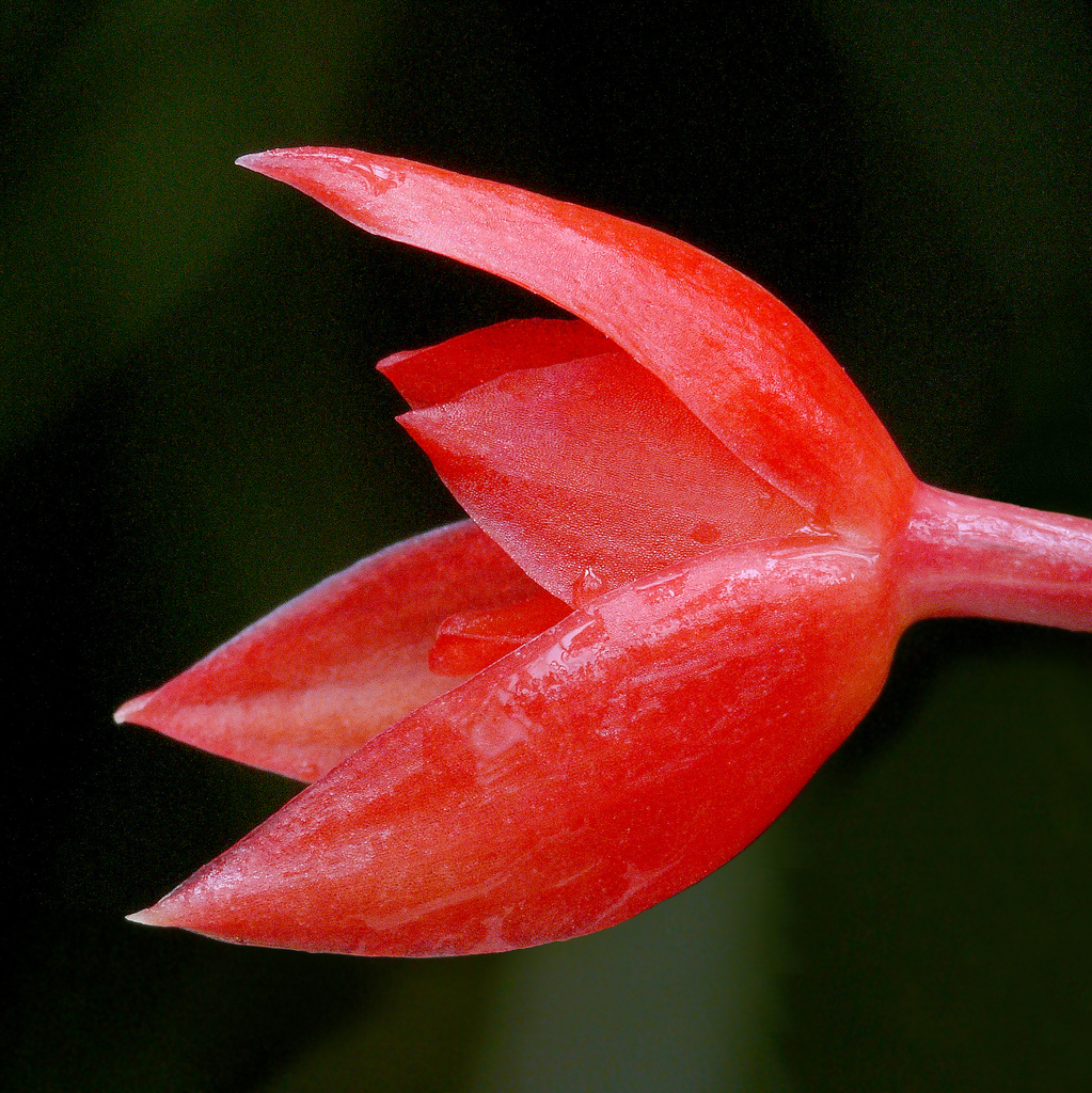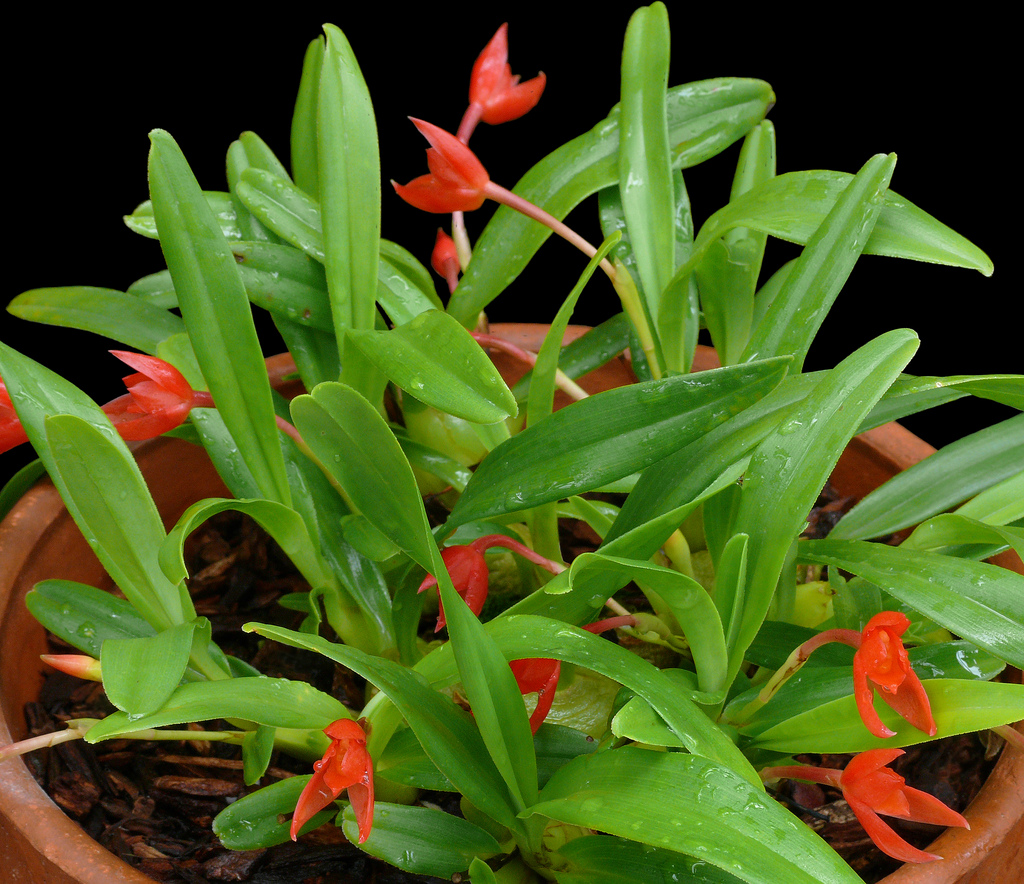 Similar to M coccinea but M donalleedodii is distinguished by its shorter apical leaves, globose pseudobulbs and longer sepals.
