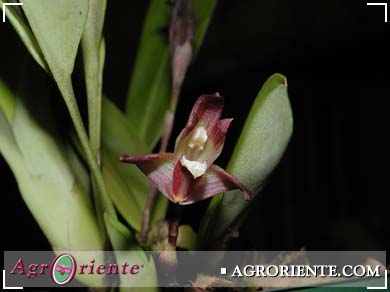 Found in Junin department of Peru in wet montane forests as a small to medium sized, warm to cool growing epiphyte with elliptic-pyriform, compressed pseudobulbs enveloped basally by a series of distichous, imbricating, leafless and leafbearing sheaths and carrying a single, elliptic-ovate, acute, attenuate to conduplicate below into the petiolate base leaf that blooms in the fall on a basal, 2.4" [6 cm] long, single flowered inflorescence enveloped completely by a series of pustulate, obovate bracts and has subsimilar, slightly shorter that the ovary floral bracts