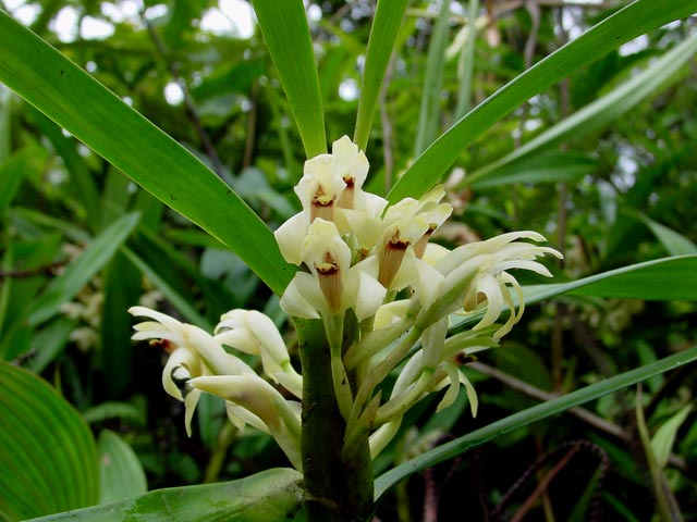 Found in Colombia and Ecuador at elevations of 1300 to 2800 meters as a medium to large sized, cool to cold growing terrestrial or epiphyte with an erect stem enveloped by imbricating sheaths giving rise to linear, conduplicate towards the base leaves that blooms on a cluster of erect, short single flowered inflorescence holding the flowers close to the leaf base.
