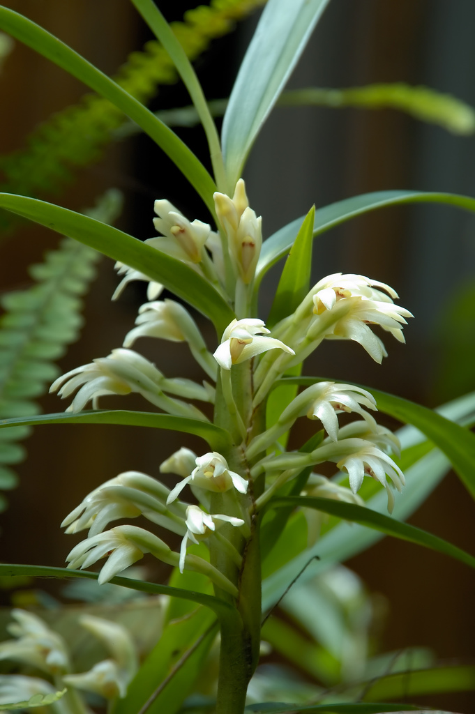 Found in Costa Rica, Panama, Colombia, Ecuador and Peru in cloud forests at elevations of 650 to 1500 meters as a giant sized, warm to cool growing epiphyte with a straggly, upright to decumbent cane enveloped by rugose sheaths and carrying subcoriaceous, linear-lanceolate, acute leaves that blooms in the spring and summer on several per axil, 2" [5 cm] long, single flowered inflorescence concealed by bracts and subtended by an inflated, floral bract.