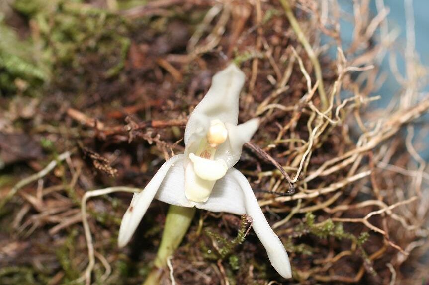 Found in Ecuador at the base of vertical limestone bluffs at elevations of 900 to 1100 meters as a medium sized, warm to cool growing epiphyte with elliptic pseudobulbs enveloped completely by a few imbricate, leaf bearing sheaths and carrying a single, apical, erect, elliptic-lanceolate, acute, gradually narrowing below into the conduplicate, elongate, petiolate base leaf and blooms in the later spring on an axillary, 5" [12.5 cm] long, single flowered inflorescence arising through the leaf sheath, and enveloped completely by imbricating, scarious, triangular, conduplicate sheaths.