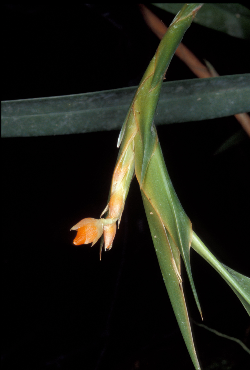 Found in Costa Rica and Panama in premontane rainforests at elevations of 500 to 1500 meters as a small to medium sized, warm to cool growing epiphyte with an elongate rhizome with 1.2 to 3.6" [3 to 9 cm] betweeen each cylindric to ovoid, compressed pseudobulb enveloped basally by 2 to 3 subulate, non-foliaceous sheaths and carrying a single, apical, erect, coriaceous, lanceolate, acute, shortly petiolate base leaf that blooms in the summer and fall on a fascile of basal, .6" [1.5 cm] long, single flowered inflorescence arising from a newly matured pseudobulb and carrying color variable flowers