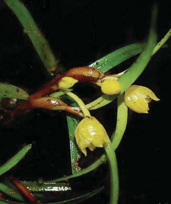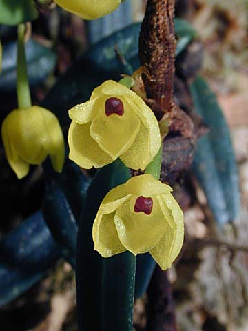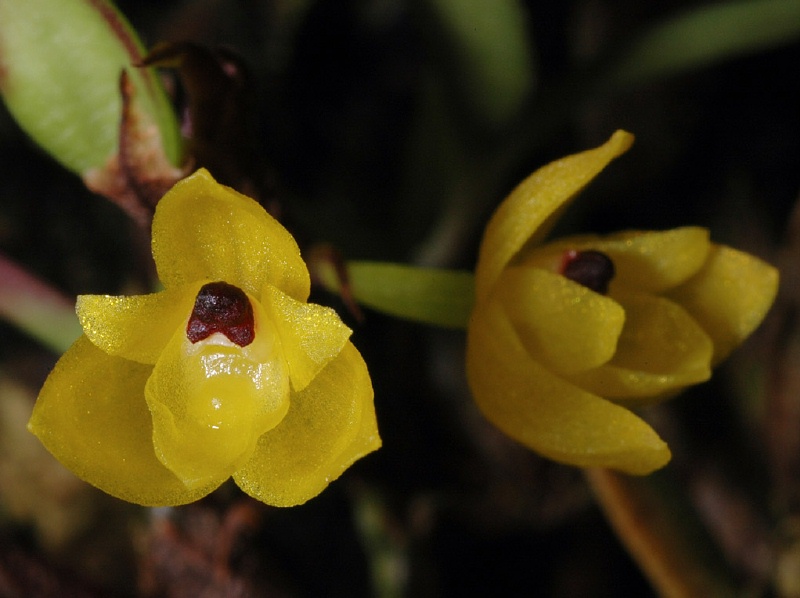 Found in Ecuador, Peru and Bolivia in wet montane forests as a mini-miniature sized, cold to cool growing epiphyte at elevations of 2400 to 2500 meters with many branched rhizomes enveloped completely by evanescent, maroon sheaths and giving rise to small, light maroon, ovoid pseudobulbs carrying 2, apical, erect, linear, apiculate, carinate dorsally leaves that blooms in the summer on a basal, short to .4" [1 cm] long, single flowered inflorescence