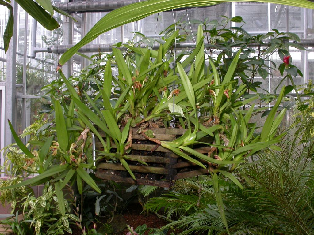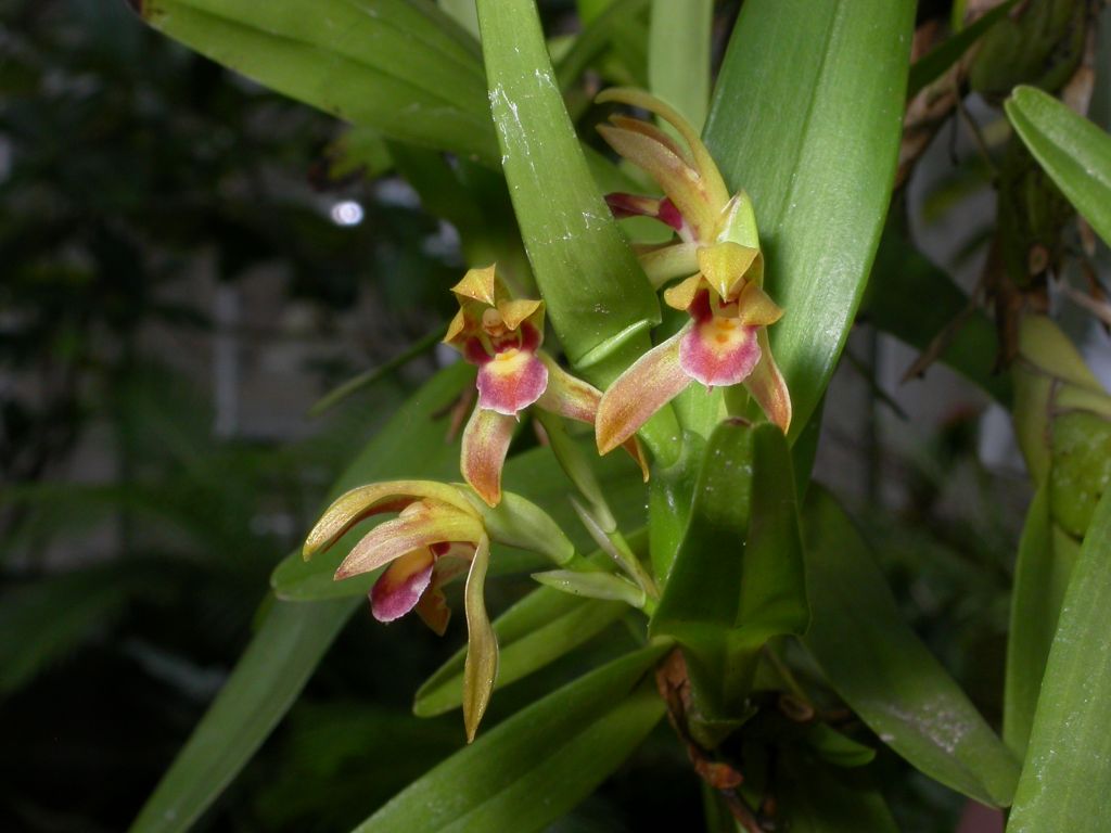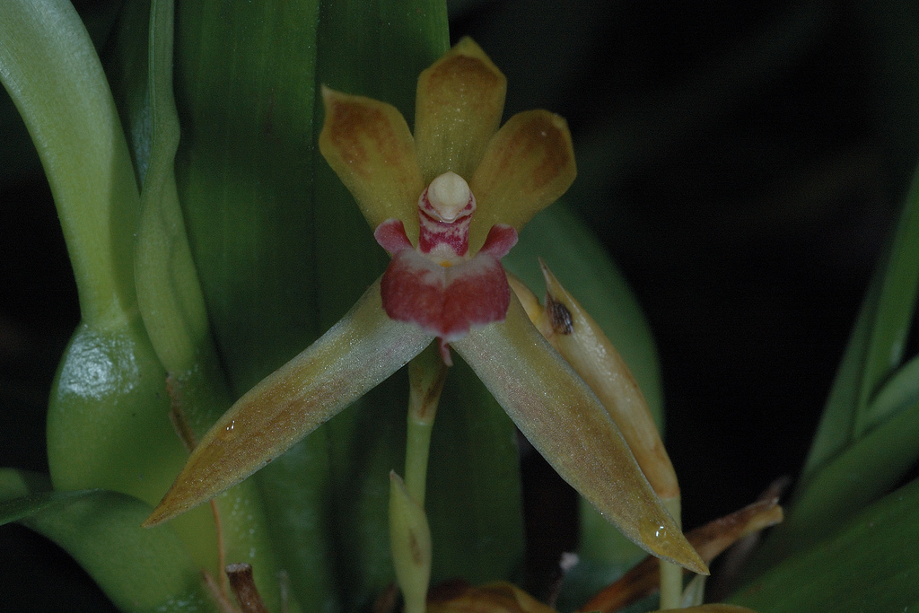 Found in Guyana, Venezuela, Colombia, Ecuador, Peru and Brazil at elevations of 100 to 1000 meters in tropical, wet cloud forests as a small to medium sized, hot growing epiphyte with an elongate rhizome between each ovate, flattened pseudobulb enveloped basally by well developed lateral leaves and sheaths and carrying a single apical, linear leaf that is conduplicate below and blooms at most any time of the year on many, basal, single flowered, to 1 1/2" [3.75 cm] long, inflorescence enveloped basally by 2 to 3, inflated sheaths