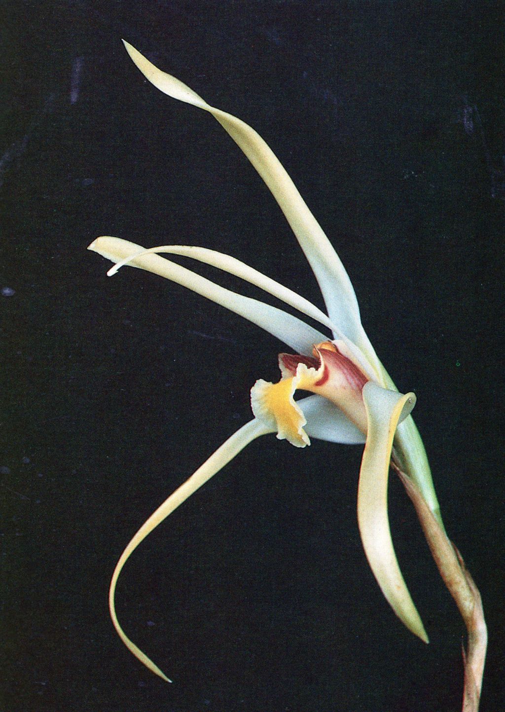 Found in Colombia, Venezuela, Guyana, Surinam?, Brazil Ecuador and Peru in wet forests at elevations around 1500 meters as a cool growing epiphyte with oblong ovoid, compressed pseudobulbs enveloped basally by imbricating, non-foliaceous sheaths and carrying a single, apical erect, coriaceous, linear-lanceolaate, narrowing below into the conduplicate, shortly petiolate base leaf that blooms on erect, enveloped by 6 tubular, slightly inflated, acute bracts, 2.4 to 3.5" [6 to 7.5 cm] long, single flowered inflorescence with a single, tubular, acute, longer than the ovary floral bract