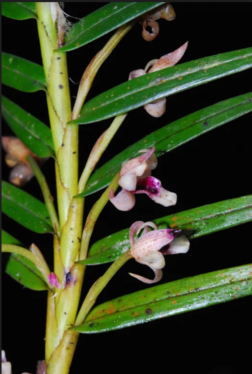 Found in Costa Rica and Panama in pluvial and cloud forests at elevations of 600 to 1700 meters as a small sized, warm to cool growing epiphyte with a decidedly vandanaceous look, with a monopodial, branching pendant stem enveloped below by scarious sheaths and above by leaf-bearing sheaths carrying narrowly lanceolate, coriaceous, shiny, acute, basally clasping leaves that blooms in the fall and early winter on a .6 to .8" [1.5 to 2 cm] long, single flowered inflorescence.