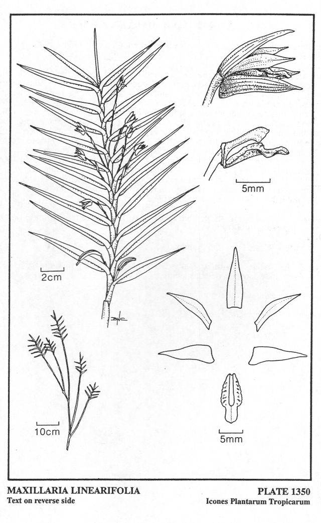 References W3 Tropicos, Kew Monocot list , IPNI ; Icones Planetarum Tropicarum plate 1350 Atwood 1989 drawing fide; Fieldiana Biology, Flora Costa Ricensis Family # 39 Orchidaceae, subtribes Maxillariinae and Oncidiinae Atwood & Mora 1999 drawing fide; Manual de Plantas de Costa Rica Vol 3 Hammel, Grayum, Herrera and Zamora 2003 drawing fide; Lankesteriana 19(1). 31 - 55 2019 as Maxillariella linearfolia photo fide; Vanishing Beauty, Native Costa Rican Orchids Vol 2 Lacaena to Pteroglossa Pupulin 2020 as Maxillariella linearfolia photo fide