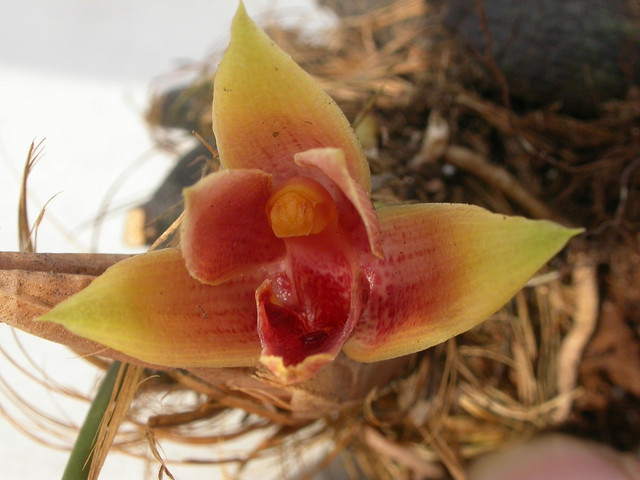 Found in Costa Rica, Panama, Venezuela and Ecuador in lowland rainforests at elevations around sea level to 550 meters as a small to medium sized, hot growing epiphyte with ovoid pseudobulbs enveloped basally by scarious, soon fibery sheaths and carrying a single apical, erect, chartaceous to subcoriaceous, linear, acute, gradually narrowing below into the elongate, petiolate base leaf that blooms in the winter and again in the later spring on an erect, shorter than the pseudobulbs, to .4" [1 cm] long, single flowered inflorescence enveloped by inflated, tubular bracts