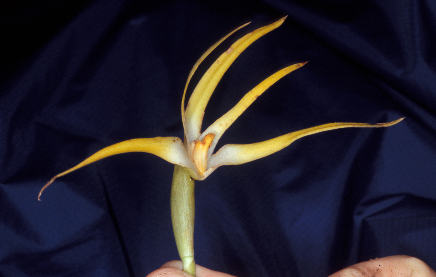 Found in Cauca department of Colombia as a medium sized epiphyte with a very short rhizome giving rise to narrowly cylindrical-ovoid, longitudinally sulcate pseudobulbs carrying an erect-patent to suberect, linear-ligulate, obtuse, narrowing and canaliculate below into the petiolate base leaf that blooms on 4 to 7, basal, arising on a newly forming pseudobulb, erect, peduncle provided with 5 to 6 clasping bracts, 2.8 to 3.2" {7 to 8 cm} long, single flowered inflorescence with as long as the ovary floral bracts that are the same as the peduncular bracts and carrying subfleshy, glabrous flowers.