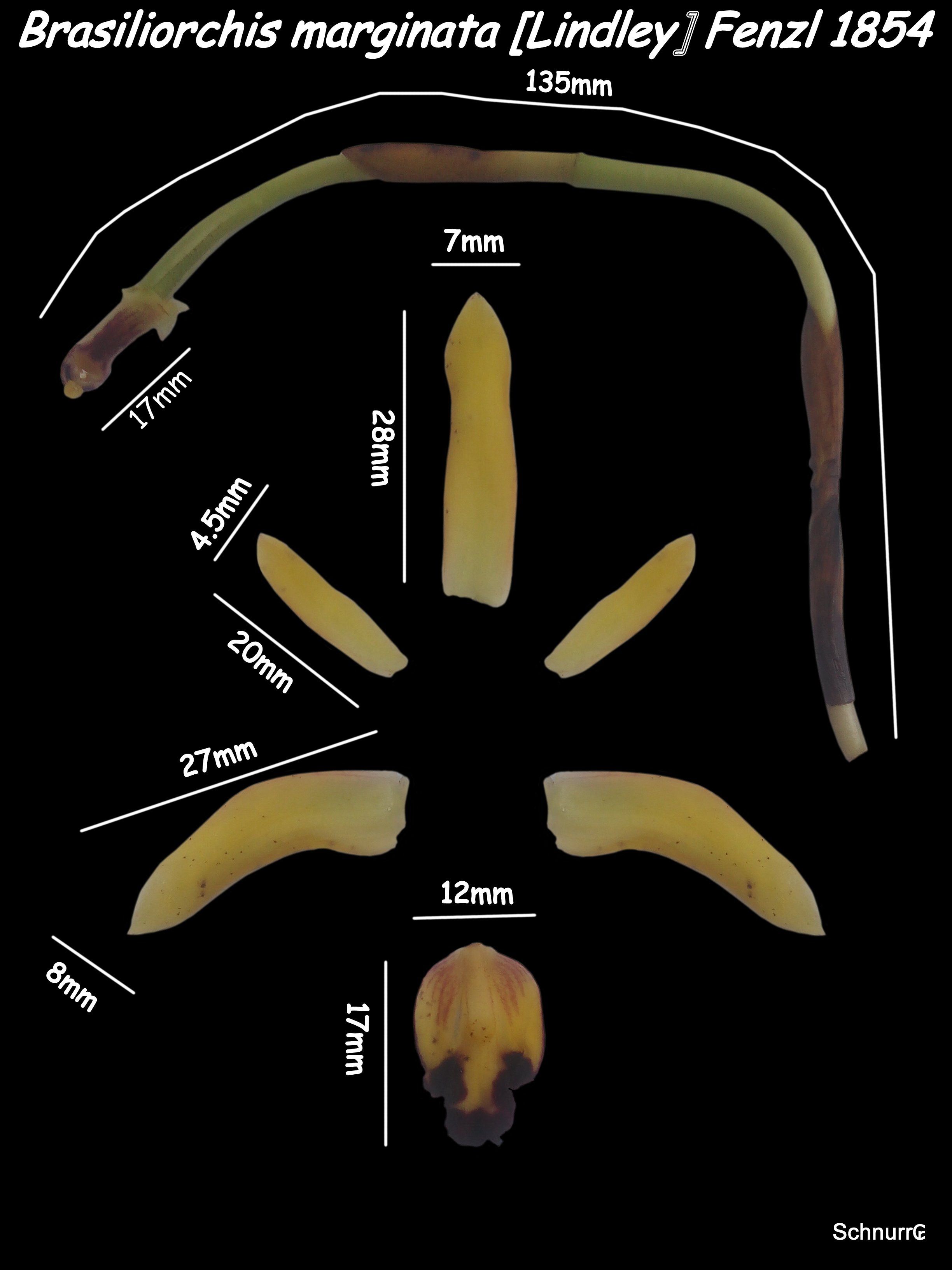 Synonyms Bolbidium marginatum (Lindl.) J.M.H.Shaw 2011; Brasiliorchis crassipes (Kraenzl.) Szlach. & Sitko 2012; Brasiliorchis marginata (Lindl.) R.B.Singer, S.Koehler & Carnevali 2007; Brasiliorchis murilliana (Hoehne) Szlach. & Sitko 2012; *Cymbidium marginatum Lindl. 1833; Maxillaria crassipes Kraenzl. 1911; Maxillaria crassipes Kraenzl. var australis Dutra ?; Maxillaria deflexa Klotzsch ex A. Br. 1852; Maxillaria murilliana Hoehne 1952; Maxillaria pantherina Hoffmanns. in ?.; Maxillaria punctulata Klotzsch 1851; Maxillaria tricolor Lindl. 1842