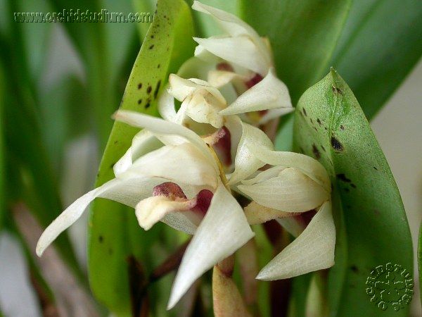 Found in Espirito Santo and Bahia states of Brazil in montane rainforests at elevations around 1000 meters as a small to medium sized, warm to cool growing epiphyte with obovate-elongate, laterally compressed pseudobulbs enveloped by leaf bearing sheaths and carrying a single, oblong-lanceolate, abruptly narrowing below into the pseudopetiolate base leaf that blooms in the fall on an axillary, 2" [5 cm] long, single flowered inflorescence