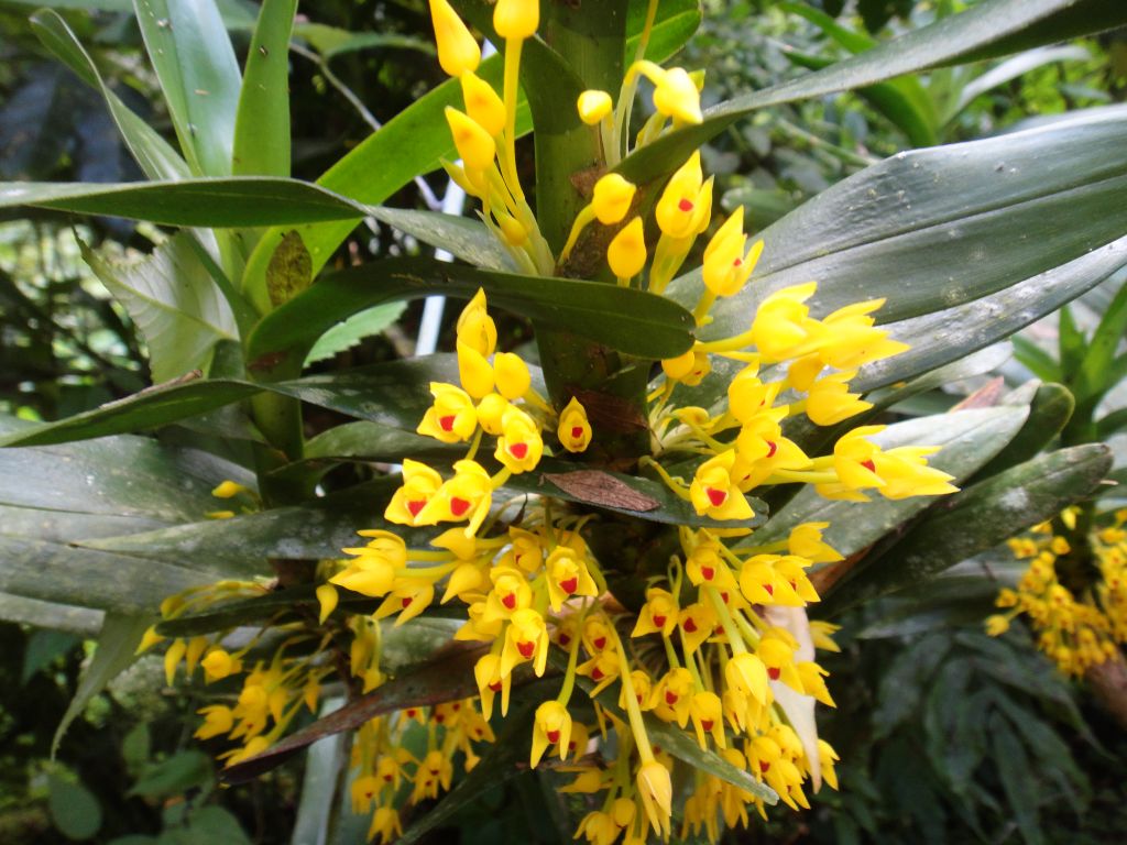 Found in Venezuela, Colombia, Ecuador and Brazil at elevations of [1200] 2000 to 2800 meters as a large to giant sized, cool to cold growing epiphyte or humus loving terrestrial with an elongate stem enveloped completely by imbricate, scarious, conduplicate, leaf-bearing sheaths the older with deciduous leaves and in the apical portion carrying narrowly oblong, rounded apically leaves and has solitary, to aggregate in small clusters, ovoid to ovoid-elliptic, strongly compressed pseudobulbs carrying a single, apical and another that is partially developed that are coriaceous, linear to linear-oblong, obtuse to slighly emarginate leaves that blooms in the winter, spring and early summer on a fasciculate, axillary, to 1.6" [4 cm] long, inflorescence arising on a mature stem.