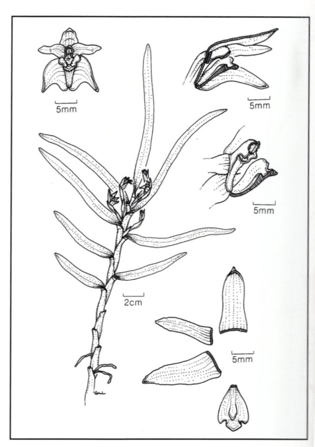 Found in Colombia and Ecuador at elevations of 550 to 1600 meters as a medium sized, warm to cool growing epiphyte with a monopodial, stem enveloped entirely by imbricating, lower leafless, upper leaf bearing sheaths that blooms on axillary, sessile, single flowered inflorescence.