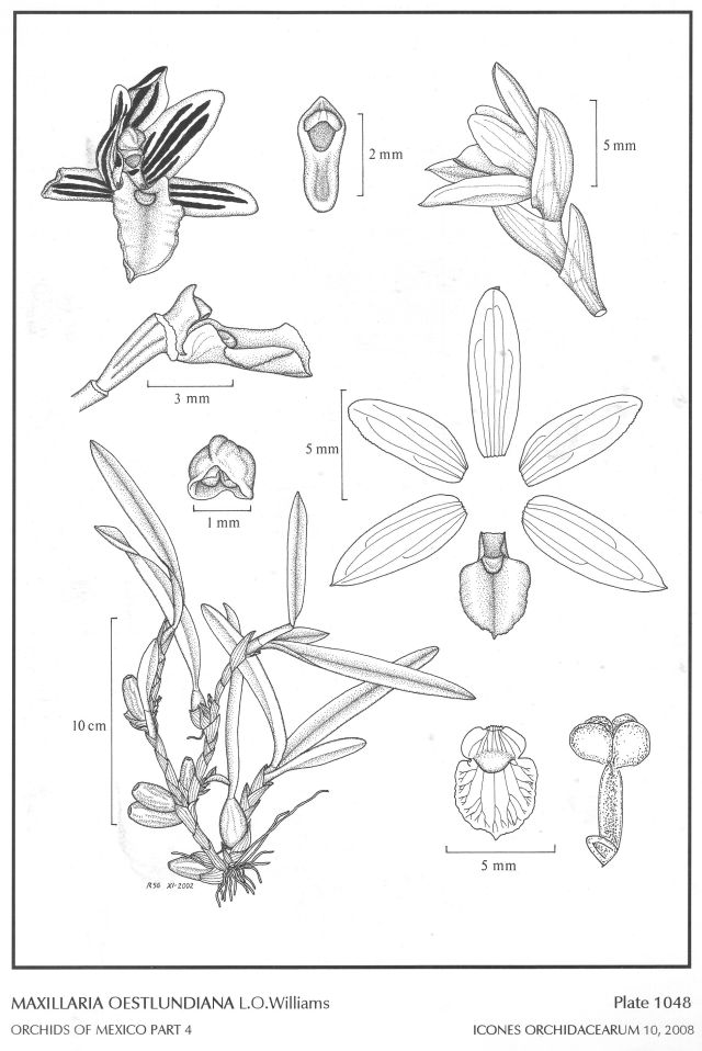 References W3 Tropicos, Kew Monocot list , IPNI ; Icones Orchidacearum 10 Plate 1048 Soto 2008 drawing fide; drawing fide; Maxillaria An Unfinished Monograph Vol 2 Christenson 2013 drawing fide;