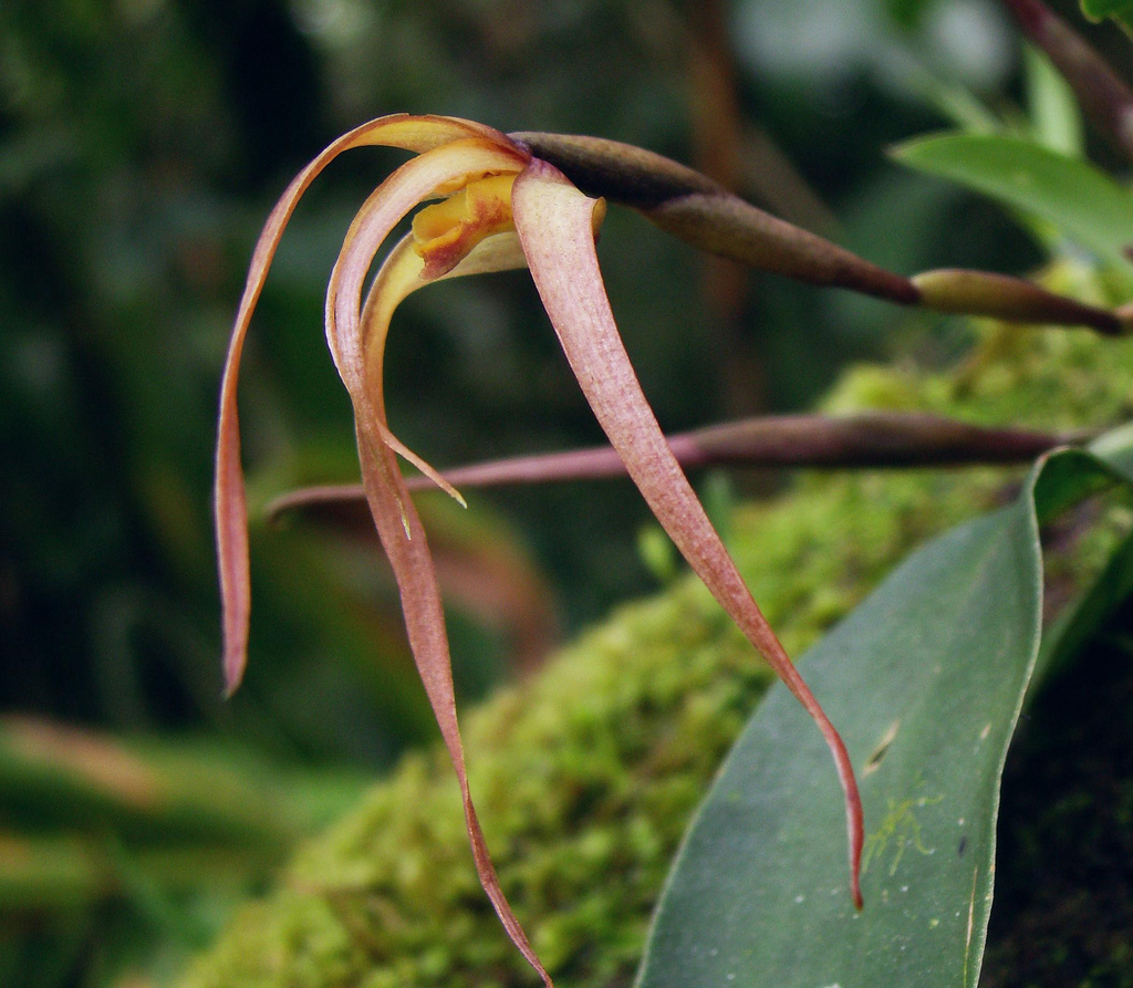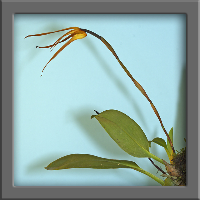 Found in Nicaragua, Costa Rica and Panama in cloud forests at elevations of 1000 to 1900 meters as a miniature sized, cool growing epiphyte with narrowly to broadly ovoid pseudobulbs enveloped basally by 1 to 2 leaf-bearing sheaths and carrying a single, apical, elliptic-ovate to linear, acute, often recurved apex, gradually narrowing below into the elongate, petiolate base leaf that blooms in the summer through early spring on a basal, 10" [25 cm] long, wiry inflorescence enveloped by 4 to 5 acute, to obtuse, involute bracts.