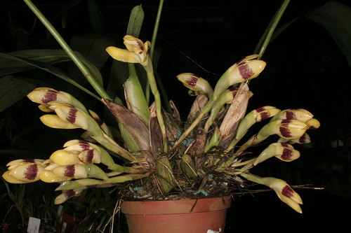 Found in eastern Ecuador in extremely wet montane forest at elevations of 750 to 1550 meters as a medium sized, warm to cool growing epiphyte with ovate, rugose, irregularily furrowed pseudobulbs enveloped basally by several, scarious, non-foliaceous sheaths and carrying 2 apical, erect, coriaceous, elliptical, acute leaves that narrows into a basal, elongate, terete petiole and blooms in the winter on several erect, basal, to 5 3/5" [to 14 cm] long, single flowered inflorescence arising on a mature pseudobulb enveloped completely by imbricating, tubular sheaths and holding the single flower beneath the leaf.
