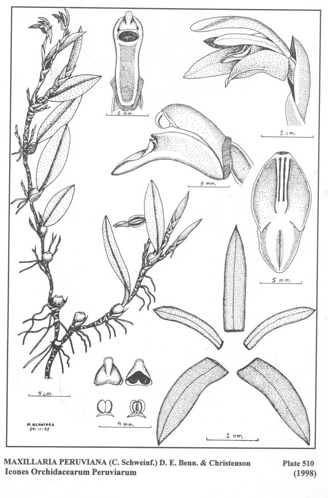 References W3 Tropicos, Kew Monocot list , IPNI ; Icones Orchidacearum Peruviarum Plate 510 Bennett & Christenson 1998 drawing fide; Maxillaria An Unfinished Monograph Vol 2 Christenson 2013;