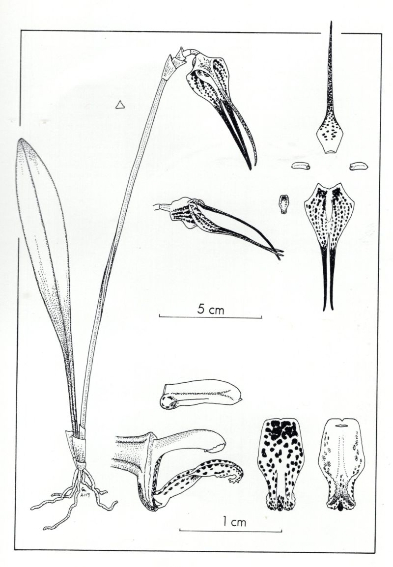 Found in Ecuador and Peru in wet montane forests at elevations of 1000 to 1500 meters as a small sized cool growing epiphyte with stout, erect ramicauls enveloped by 2 to 3 loose, tubular sheaths carrying a single, apical, erect, thickly coriaceous, elliptical, subacute leaf with the base cuneate into the channeled petiole where in nature it blooms in the winter and early spring on a congested, erect, triquetrous, 6 to 12" [15 to 30 cm] long, successively several flowered, racemose, inflorescence arising from the base of the ramicaul with a basal bract and thin imbricating floral bratcs with flowers that never really open fully held above the leaf.