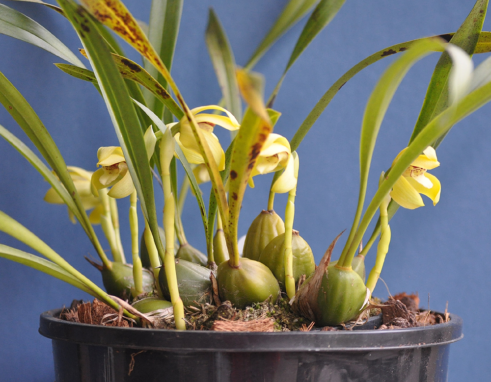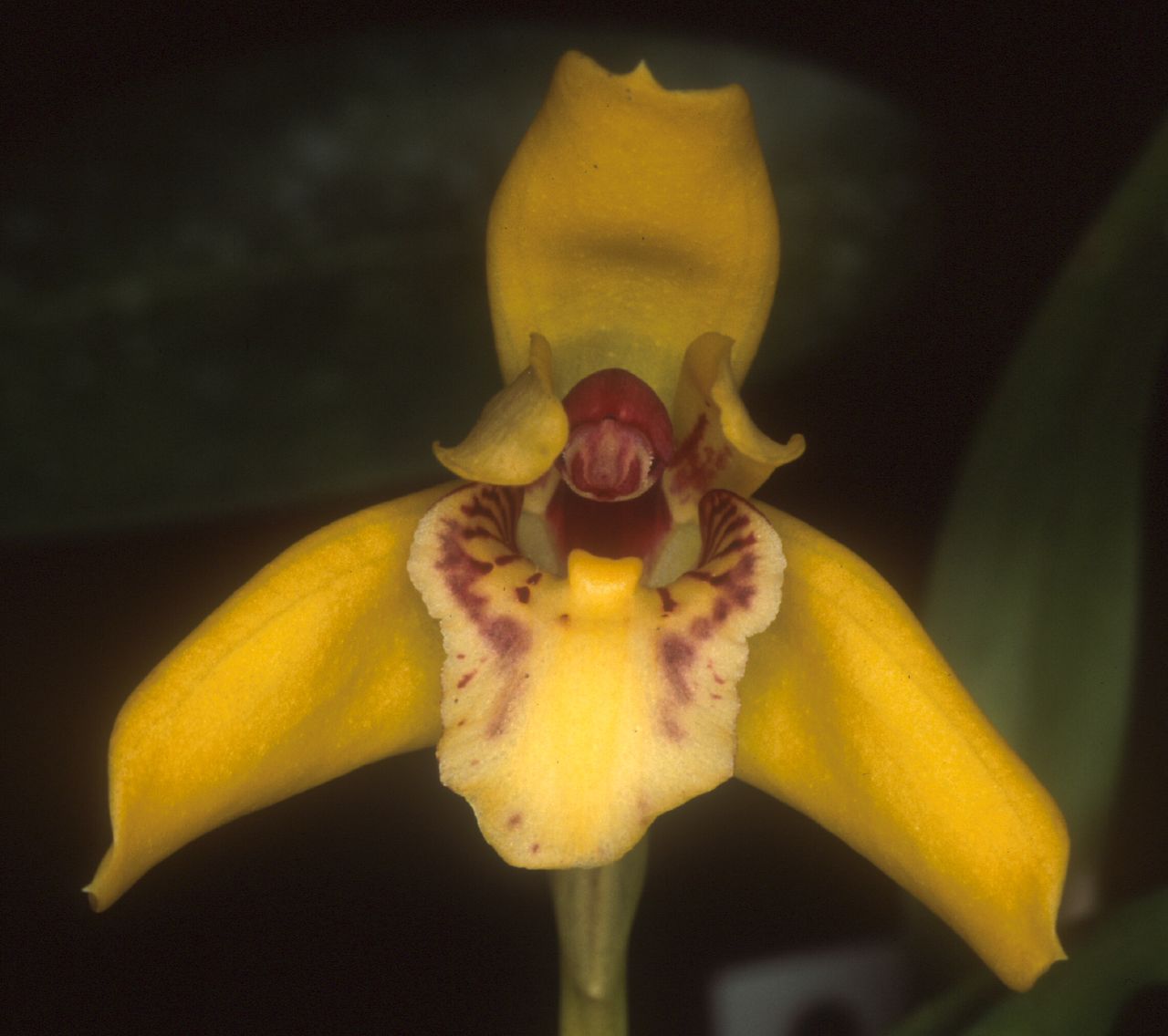 Found in Brazil as a large sized, hot to cool growing epiphyte with clustered, ovoid to globose, slightly compressed, sulcate with age pseudobulbs and has 2, linear-ligulate, obtuse leaves that blooms in the late fall and winter in situ, on 2 to 4, erect, 3 to 4 3/4" " [7.5 to 12 cm] long, single flowered inflorescence enveloped by 2 distant, acuminate, sheaths and holding the fragrant long-lasting flowers amid or below the leaves.