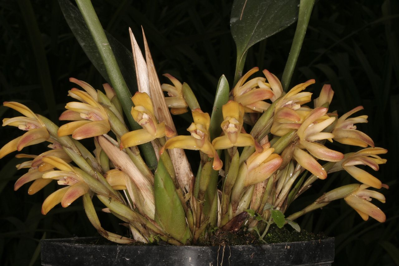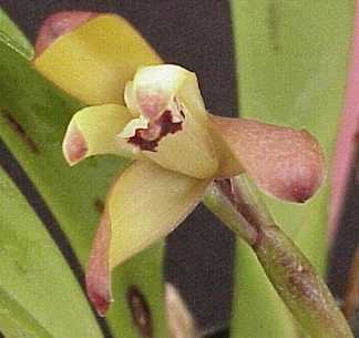Found in Nicaragua, Costa Rica, Panama, Colombia, Ecuador, Peru, Brazil and Venezuela in rain and cloud forests at elevations of 200 to 2100 meters as a variable sized hot to cool growing epiphyte with an ovoid-ellipsoid, smooth pseudobulb subtended by several scarious sheaths and has a single, apical, oblanceolate, curved leaf that is condulicate towards the base that blooms in the summer and fall on a basal, from the imbricating basal sheaths, 5" [12.5 cm] long, single flowered inflorescence with several sacrious, tubular bracts.