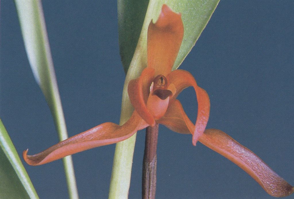 Found in Ecuador at elevations of 1900 to 2300 meters as a medium sized, cool to cold growing epiphtye with ellipsoid, compressed pseudobulbs carrying a single apical, elliptic-lanceolate, acute, conduplicate petiolate base leaf that blooms on an erect, to 5.2" [to 13.3 cm], single flowered inflorescence arising with a new growth, enveloped by thin, papery, purple brown bracts and carrying a single, nodding, fleshy flower.