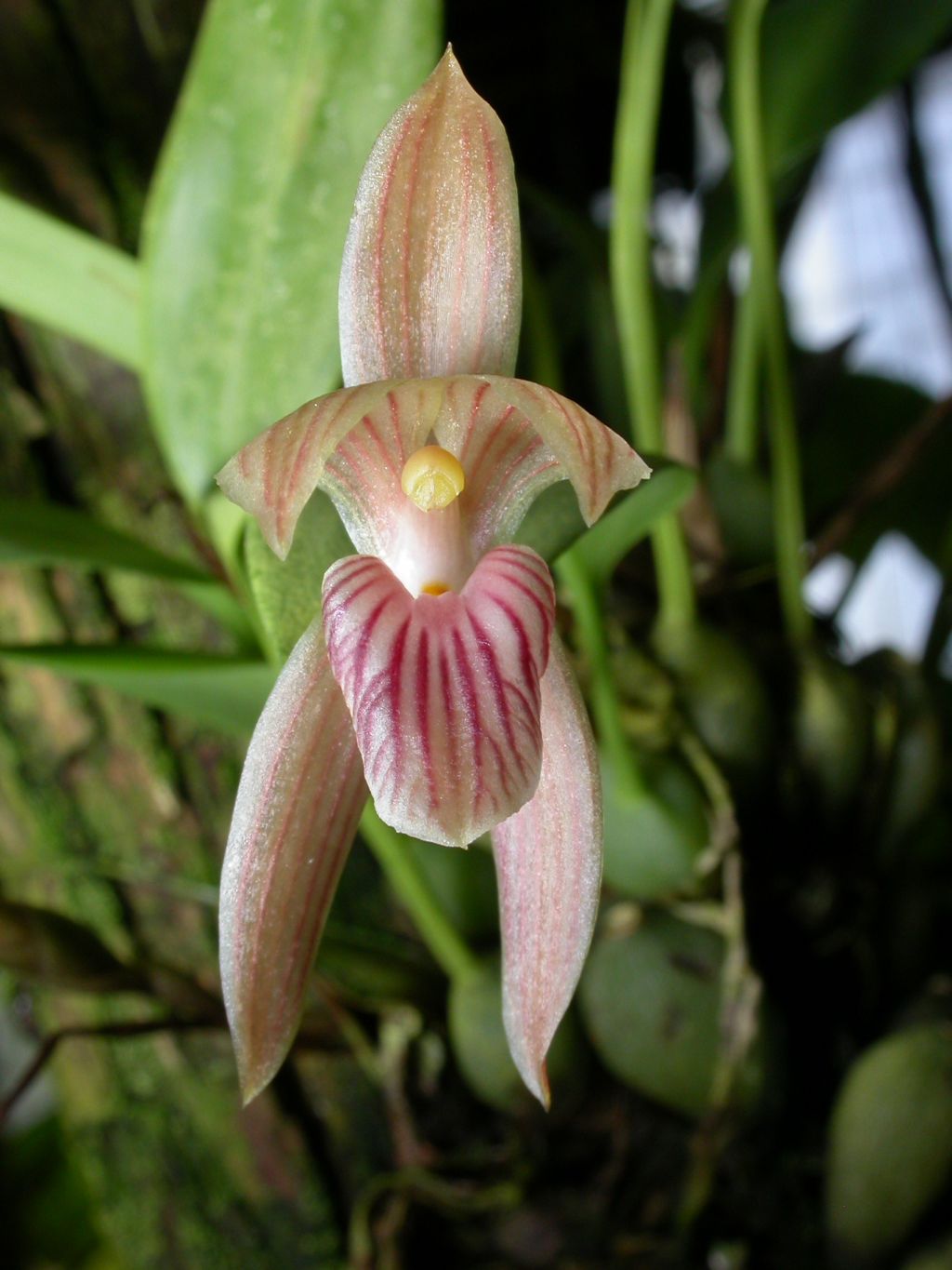 Found in Colombia, Ecuador, Peru and Bolivia at elevations of 2220 to 2800 meters as a small sized, cold growing epiphyte with clustered, broadly ovate, longitudinally compressed, ribbed pseudobulbs enveloped partially by several distichous, scarious sheaths and carrying a single, apical, narrowly oblong, gradually narrowing below into the elongate, channeled petiolate base leaf that blooms in the summer on a basal, erect, 3.2" [8 cm] long, single flowered inflorescence enveloped by 4 to 5, inflated, distichous, imbricate, acuminate bracts arising with a new growth and holding the flower at about mid-leaf