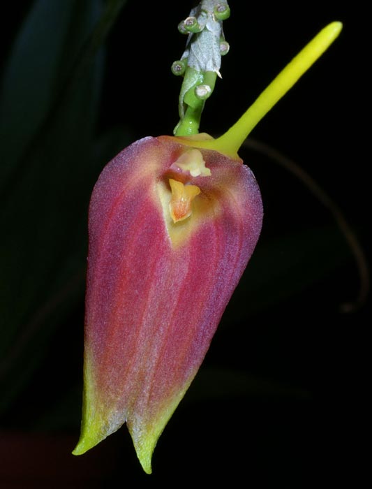 Found in Ecuador at elevations of 200 to 850 meters as a miniature sized, hot to warm growing epiphyte with erect, stout ramicauls enveloped basally by 2 to 3 loose, tubular sheaths and carrying a single, apical, erect, coriaceous, ellitical, subacute to obtuse, narrowly cuneate below into the petiolate base leaf that blooms on a slender, ascending erect, triquetrous, very congested, successive several flowered, racemose, 8 to 10" [20 to 25 cm] long inflorescence arising from low on the ramicaul with a bract at the base and inflated, imbricating floral bracts.