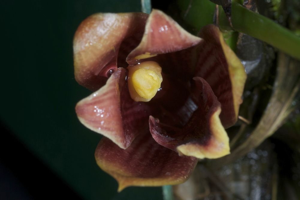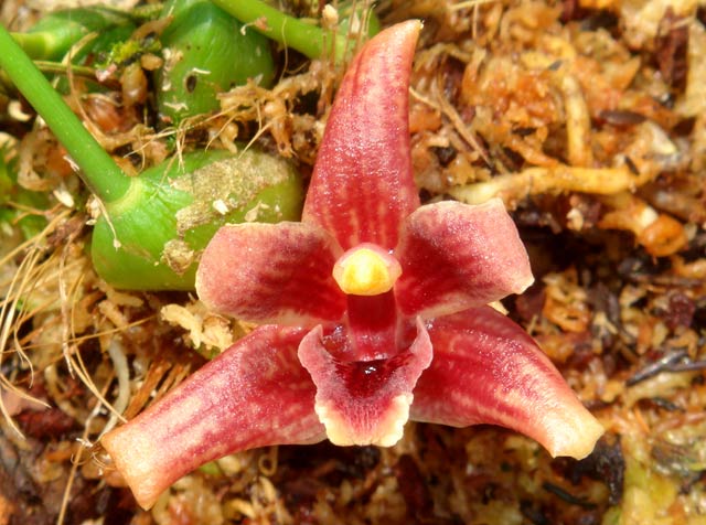Found in Colombia and Ecuador at elevations around 150 to 500 meters as a small sized, hot growing epiphyte with ovoid-ellipsoid, compressed pseudobulbs enveloped by papery sheaths and carrying a single, apical, narrowly elliptic, acute, long petiolate base leaf that blooms in the summer on subsessile, peduncle less that .8" [2 cm] long, single flowered inflorescence with lanceolate, shorter than the ovary floral bracts and carrying upward facing, cupped flowers.