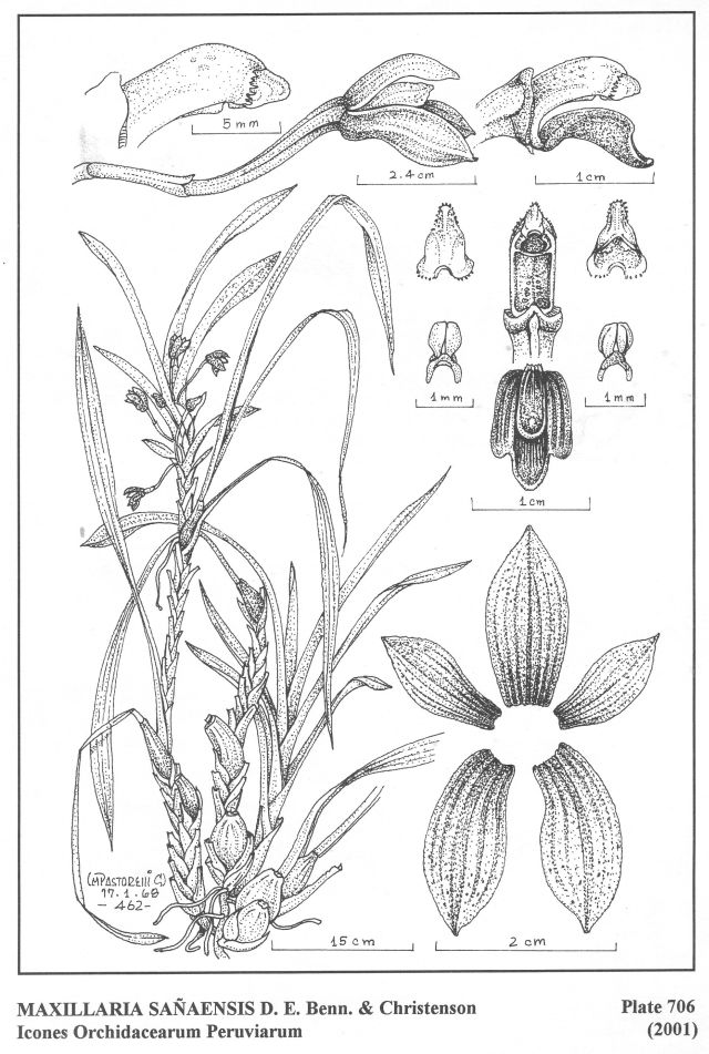 Maxillaria sanaensis D.E.Benn. & Christenson 2001 sect. Ornithidium [Salisb.] Christenson 2013 TYPE Drawing by © Pastorelli, Bennett & Christenson