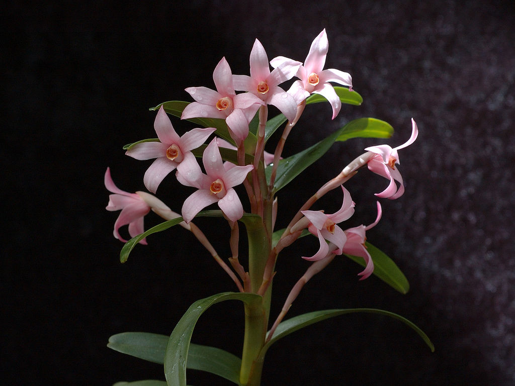 Found in Panama in rainforests at elevations of 1000 to 1300 meters as a large to giant sized, cool growing stiffly erect epiphyte with a leafy, eventually basally branching stem carrying numerous, strongly 2 ranked, oblong-lanceolate, bilobed-apiculate, stiffly leathery, dark green sometimes strongly suffused with dark purple leaves that blooms in the later spring on short, axillary, peduncles to 2" [5 cm] long, many flowered inflorescence with slightly longer than the ovaries, ovate, acute floral bracts.