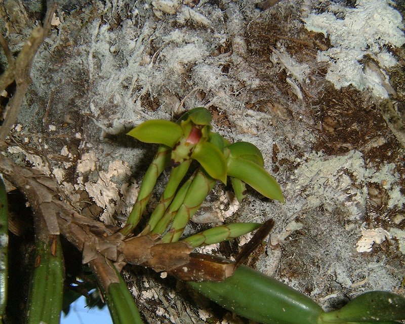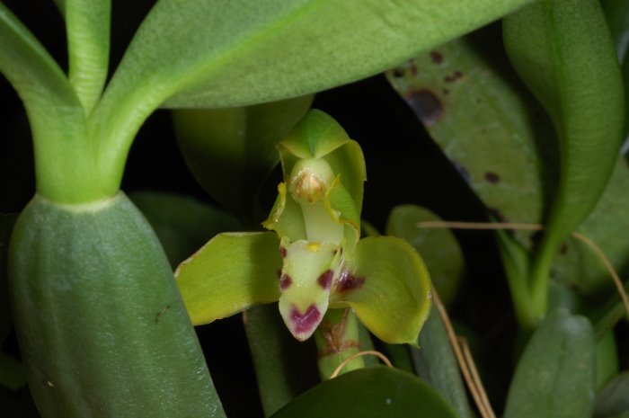 Found from Mexico, Guatemala, Honduras, El Salvador, Nicaragua, Costa Rica, Panama, Colombia, Ecuador and Peru in wet montane forests as a miniature to large sized, hot to cold growing epiphyte at elevations of 100 to 3100 meters with hard shiny green, sulcate, banana-shaped pseudobulbs that are subtended by scarious bracts and carrying 2 to 3 apical, deciduous, fleshy, hard, linear-oblong, conduplicate below into the petiolate base leaves that blooms at most any time of the year on a basal, 1 1/2" [4 cm] long, single flowered inflorescence that is surrounded by imbricating sheaths and arising on a mature pseudobulb.