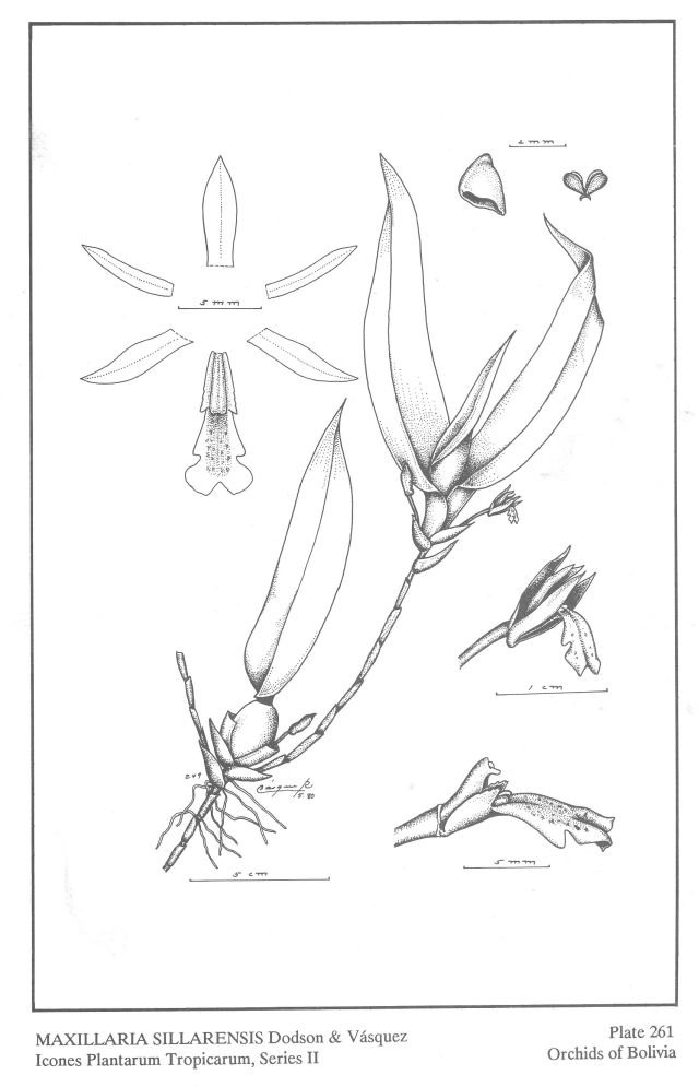 References W3 Tropicos, Kew Monocot list , IPNI ; *Icones Plantarum Tropicarum Plate 261 Dodson & Vasquez 1989 drawing fide; Maxillaria An Unfinished Monograph Vol 2 Christenson 2013; The Parque Nacional Carrasco, Cochabamba Bolivia, Orquideas del Proyecto Hidroelectrico Ivirizu Website 2021 photo fide;
