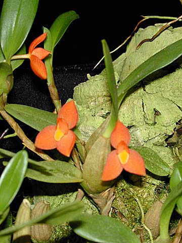 Found in Venezuela and northeastern Colombia in cloud forests at altitudes of 750 to 1700 meters as a dwarf sized, mat forming, cool to warm growing species with a rhizome enveloped by brown sheaths carrying ovoid, compressed, dull brown pseudobulbs subtended by 1 or 2 leaf bearing sheaths and carrying a single, apical, oblong-elliptic, minutely apiculate, coriaceous leaf that blooms in the fall and early winter, dwarfing the plant, on a basal, 1 1/2" [4 cm] long, single flowered inflorescence arising on a mature, prominent, unifoliate pseudobulb as a new growth arises that is subtended by a floral bract.