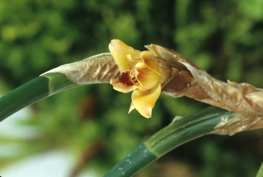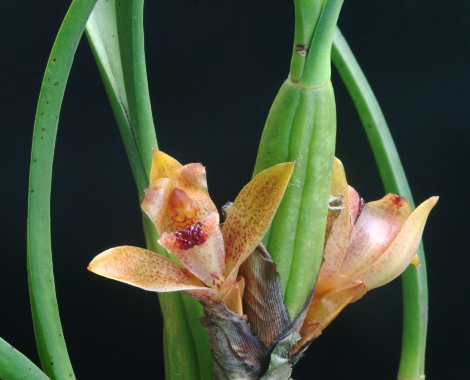 Found in southeastern Brazil as a small sized, warm to cool growing epiphyte with cylindric-fusiform, 6 ridged, longitudinally sulcate pseudobulbs carrying a single [rarely 2], erect, fleshy, semi-conduplicate to terete, linear, acuminate, attenuate below into the base leaf that blooms in the spring on a short, as long or a little longer than the pseudobulb, single flowered inflorescence arising through 2 long bracts.