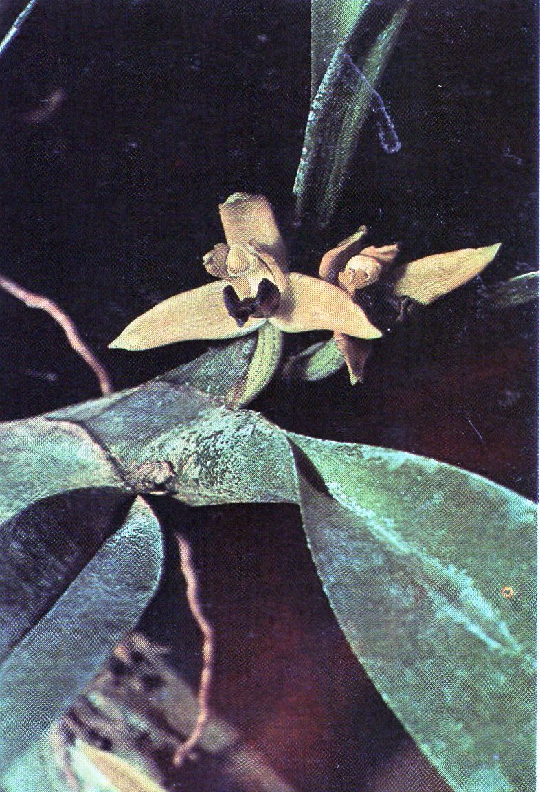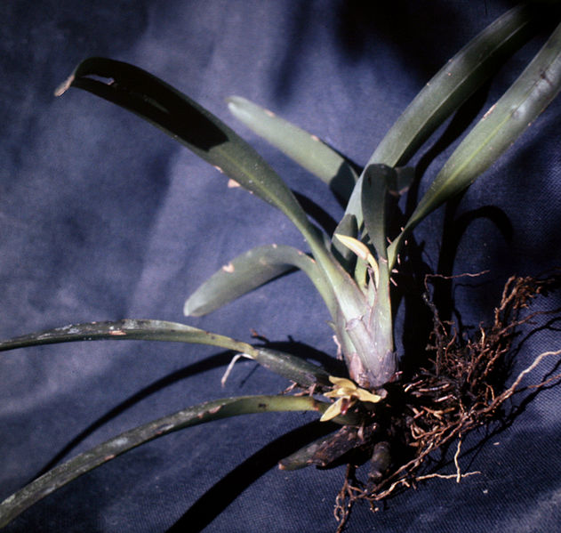 Found in Venezuela, Guyana, Fr Guiana, Surinam, Ecuador, Peru and northern Brazil in moist lowlands to lower montane forests at elevations of 50 to 800 meters as a small to medium sized, hot to warm, caespitose, erect to pendant growing epiphyte with relatively small, ovoid, flattened, rugose pseudobulbs enveloped basally by distichous, imbricating, leaf-bearing sheaths and carrying a single, fleshy, straight to arching, linear, unequally bilobed apically leaves that blooms at most any time of the year on an axillary, short to 1.6" [4 cm] long, erect to horizontal, successively single flowered inflorescence