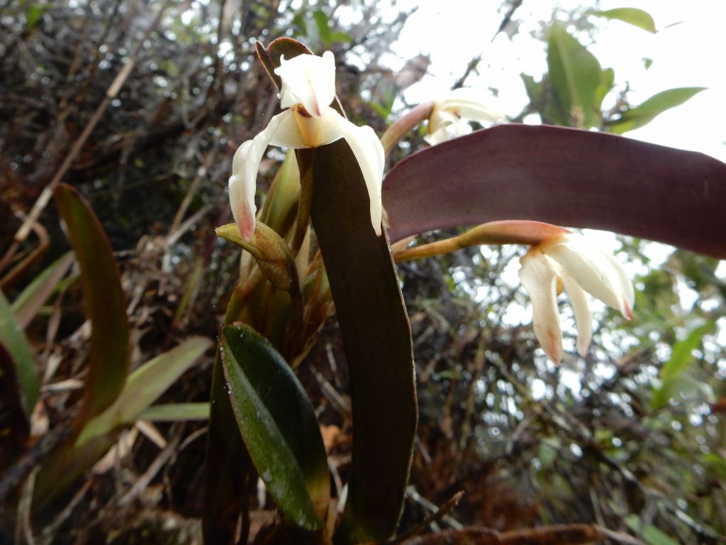 Found in Colombia on the western slope of the western Cordillera in wet cloud forests on road banks at elevations around 1900 to 2500 meters as a large sized, cool to cold growing terrestrial with ascending rhizomes enveloped by conduplicate, triangular sheaths giving rise to spaced 6" [15 cm] apart, purplish green, slightly compressed, ovate, rugose pseudobulbs enveloped basally by imbricate sheaths and carrying a single, apical, erect, dark green adaxially, purple beneath, elliptic-ovate, rounded-retuse and asymetrical apically, coriaceous, conduplicate below leaf that blooms in the winter on numerous, mostly basal, 1 to 3 from the rhizome, peduncle to 3.8" [9 cm] long, somewhat fractiflex, enveloped by 5 to 7, greenish tinged with purple towards the apex, lanceolate bracts, to 4.8" [12 cm] long overall, fasciculate, single flowered inflorescence with lanceolate, longer than the ovary floral bracts.