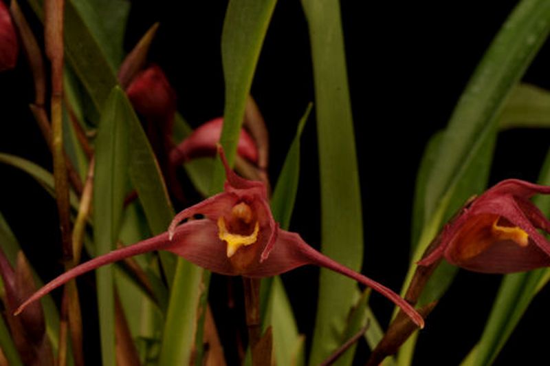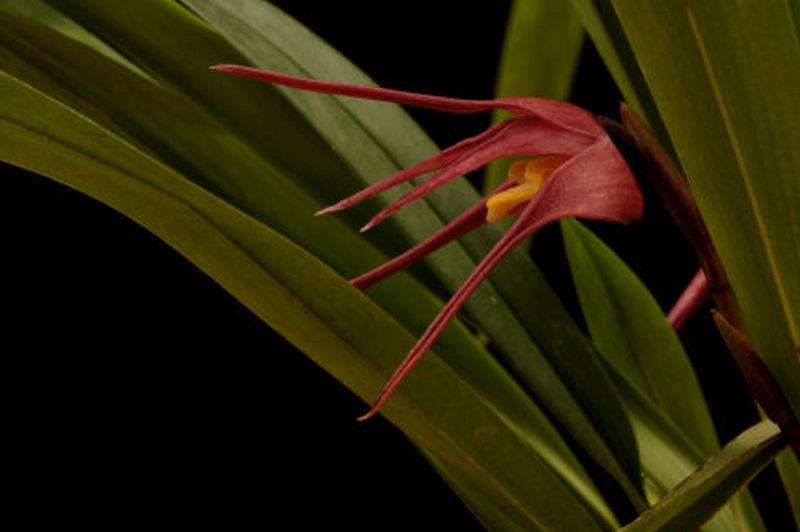 Found in Colombia and Ecuador at elevations of 1100 to 1500 meters as a cool growing epiphtye with fusiform pseudobulbs carrying a single, apical, erect, linear, obtuse, conduplicate below into the petiolate base leaf that blooms on basal, erect, 4" [10 cm] long, single flowered inflorescence.
