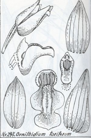 References W3 Tropicos, Kew Monocot list, IPNI Repert. Spec. Nov. Regni Veg. Beih. 7: 179 Schlechter 1920 as Orniothidium toriferum; Repert. Spec. Nov. Regni Veg. Beih.57:244 Schlechter1929 as Ornithidium toriferum drawing fide; *Orquideologia Vol 18 #1 1991 as