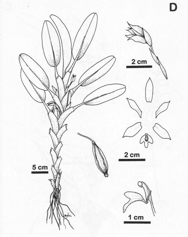 Found in Costa Rica and western Panama in cloud forests at elevations 1000 to 1700 meters as a large sized, cool growing epiphyte with a monopodial stem carrying subcoriaceous, ovoid, apically rounded to acute leaves that blooms in the fall, winter and spring on several per leaf axil, to 3.2" [8 cm] long, single flowered inflorescence carrying small white flowers with a red and yellow lip.