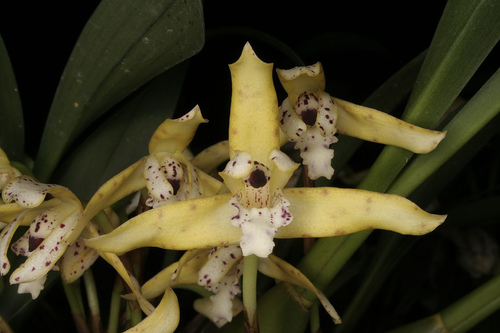 Found in southeastern Brazil in the Serra do Mar as a small to medium sized, warm to cold growing epiphyte with angular ovoid, slightly compressed pseudobulbs enveloped basally by deciduous, imbricate sheaths and carrying 2 apical, erect, long lanceolate, acute, attenuate below into the pseudo-petiolate base leaves that blooms in the late winter and early spring on 1 to 3, axillary, 6 to 8" [15 to 20 cm] long, single flowered inflorescence
