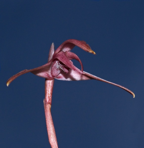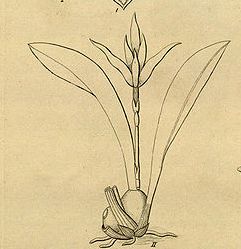 Found in Colombia, Venezuela and the Venezuelan Antillies at elevations of 500 to 1900 meters as a miniature to small sized, warm to cool growing epiphyte with an abbreviated rhizome giving rise to clustered, ovate, subancipitous, compressed pseudobulbs enveloped by several, imbricate, inner ones leaf bearing sheaths and carrying a single, apical, oblong-ligulate, acute, attenuate into the conduplicate petiolate base leaf that blooms in the winter on an axillary, erect, single flowered inflorescence enveloped by imbricate, scarious bracts.