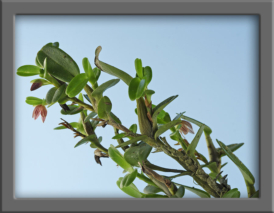 Found in Costa Rica, Panama? and Colombia? in premontane forests at elevations of 500 to 1300 meters as a miniature sized, warm to cool growing epiphyte with 1.6" [4 cm] between each cylindric to tapered pseudobulb enveloped in youth by 1 to 2, foliaceous sheaths and carrying a single, apical, coriaceous to fleshy, sessile, elliptic, unequally bilobed apically leaf that blooms in the summer, fall through winter on a .4" [1 cm] long, single flowered inflorescence arising on a newly forming growth and subtended by a floral bract.
