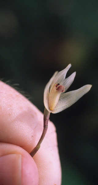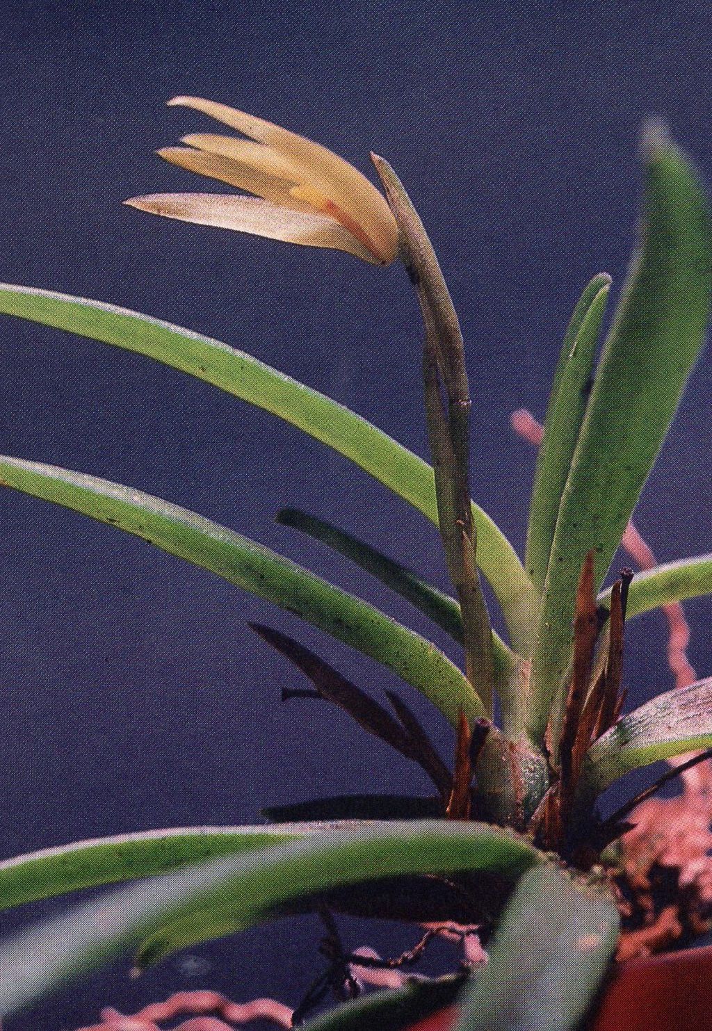Found in Nicaragua?, Venezuela, Guyana, Surinam, northern Brazil, Ecuador, Peru and Bolivia in rainforests at elevations of 100 to 2000 meters as a miniature sized, hot to cool growing epiphyte with small, ovate pseudobulbs enveloped basally by 2 to 3 leaf-bearing sheaths and carrying a single apical, erect, spathulate, obtuse, unequally bilobed apically, narrowing into the conduplicate base leaf that blooms in the summer, fall and winter on an erect to horizontal, longer than the pseudobulb, single flowered inflorescence