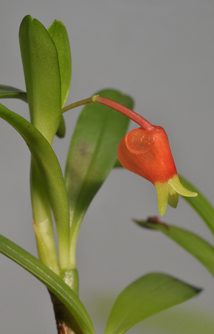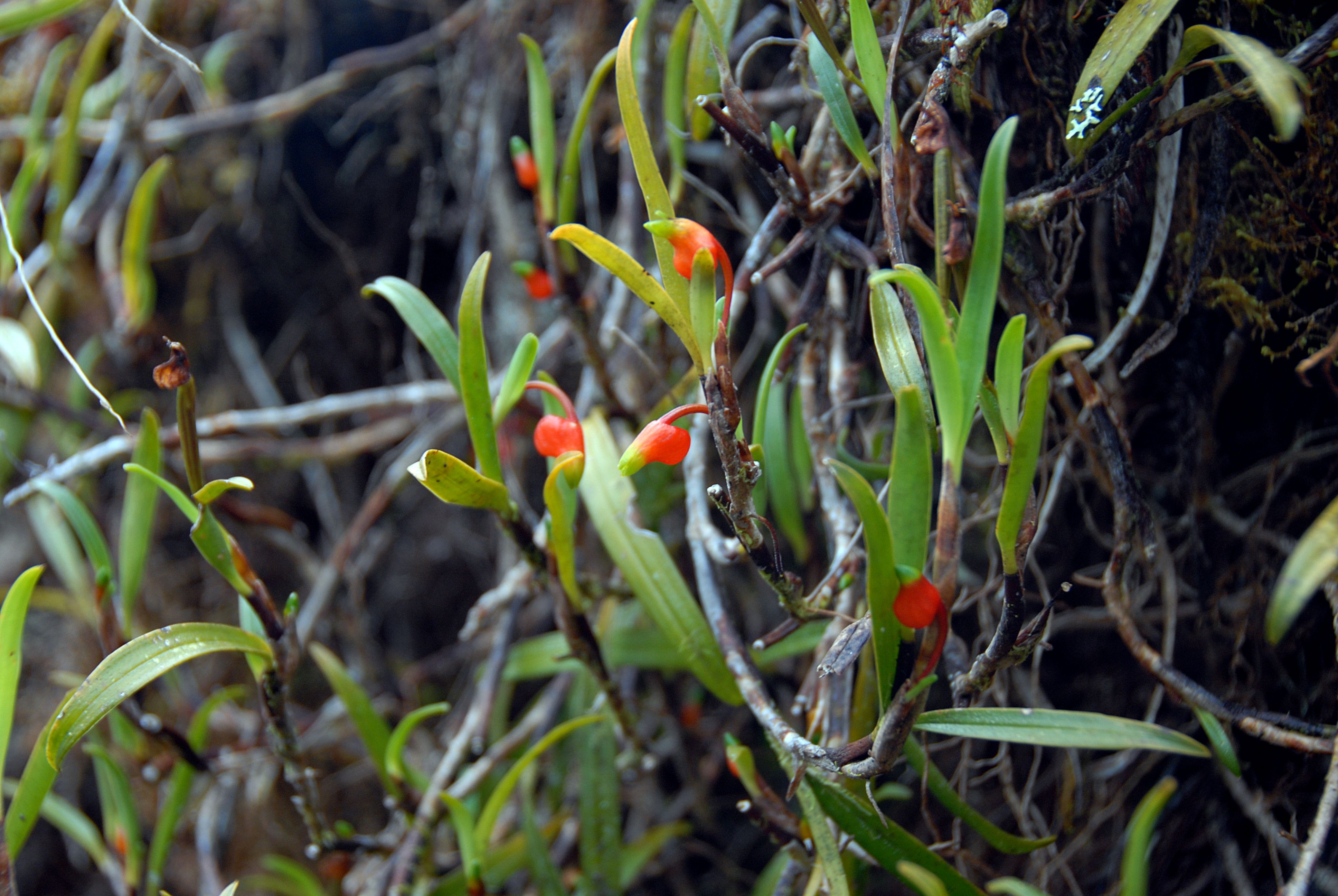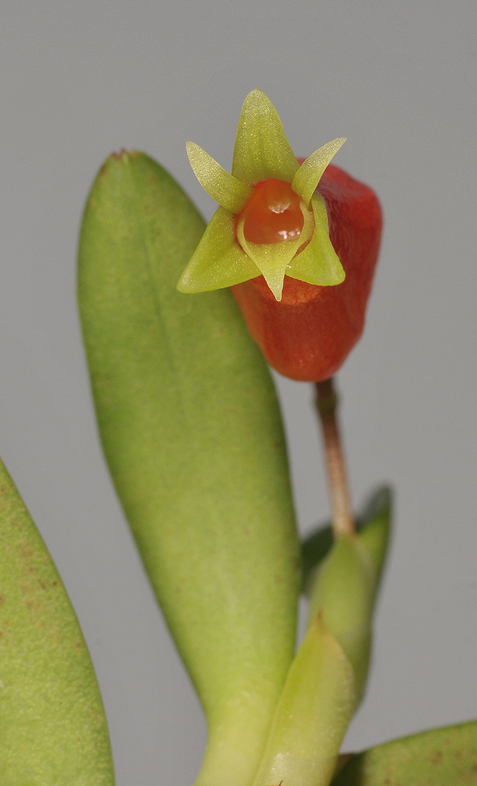 Found in New Guinea, Solomon Islands and Vanuatu in mossy forests on trunks and logs or in alpine grasslands in moss cushions or on tree fern at elevations of 760 to 3600 meters as a miniature sized, warm to cold growing epiphyte or terrestrial with cylindrical to ovoid, basally elongated pseudobulb and carrying 1 to 2 apical, sessile to subpetiolate, linear to elliptic, flat to rarely semi-terete, glabrous, margins entire, apically rounded and somewhat bilobed leaves that blooms at any time of the year on a solitary, synanthous, to 1.4" [to 3.5 cm] long, single flowered inflorescence.