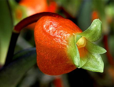 Found in New Guinea on trees in montane forests at elevations of 800 to 2300 meters as a small sized, warm to cold growing epiphyte with a terete, decumbent rhizome giving rise to suberect, basally slightly dilated cylindrical pseudobulbs carrying a single, apical, erect, ligulate, shortly and unequally bilobed apically leaf that blooms in the spring on a thin, .4 to .8" [1 to 2 cm] long, single flowered inflorescence.