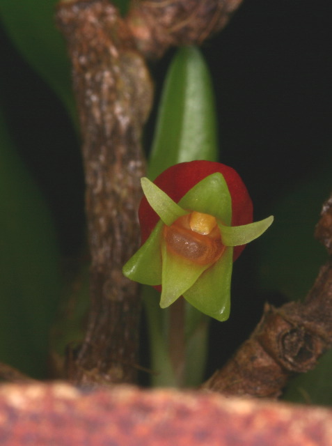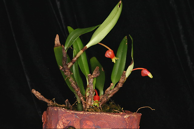 A small sized, warm to cool growing epiphyte with a single leafed pseudobulb and an erect growth habit instead of a flat creeping habit that blooms in the spring.