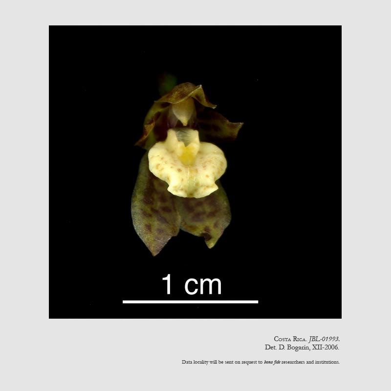 Found from Nicaragua to Panama in premontane cloud forests at elevations of 800 to 1200 meters as a miniature to small sized, warm to cool growing, caespitose epiphyte to 10" [25 cm] tall with elliptic-ovoid, laterally compressed pseudobulbs subtended by two or more leaf-bearing sheaths and has a single, apical, elliptic-lanceolate, subcoriaceous, carinate beneath, acute, conduplicate below into the petiolate base leaf, that blooms in the fall on a lateral, arcuate, or subpendant, 8 to 10" [20 to 25 cm] long, panicle arising on a mature pseudobulb with 10 to 15 smaller flowers that are loosely situated on the branches.