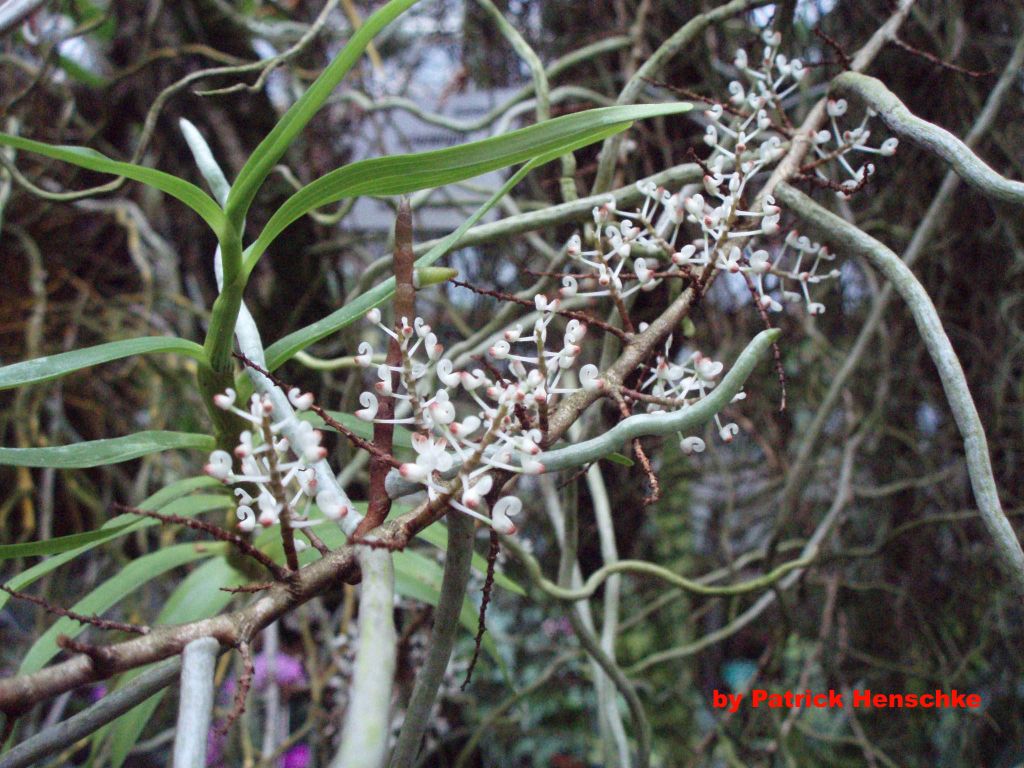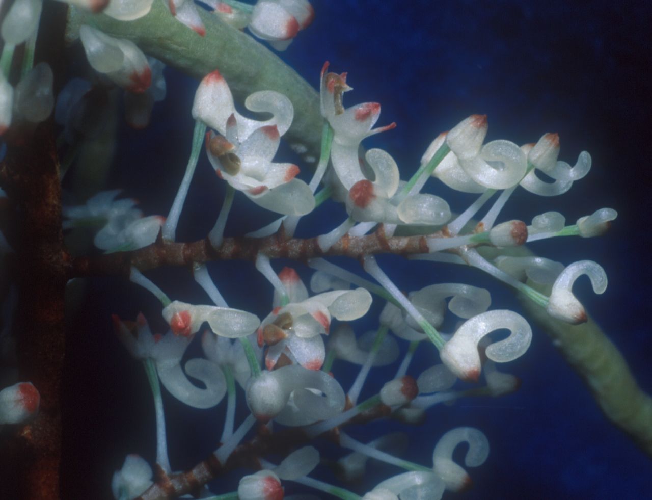 Found in Tanzania, Uganda, Kenya, Zimbabwe, Madagascar, Zanzibar, the Mascarene Islands and Mozambique at elevations of sea level to 300 meters in thickets and bushes near the coast as a miniature sized, hot to warm growing epiphyte with slender elongate stems giving rise to many roots all along and no leaves. The orchid blooms in the winter and spring on many, all along the stem, .4 to 1" [1 to 2.5 cm] long, 8 to 16 flowered inflorescence.