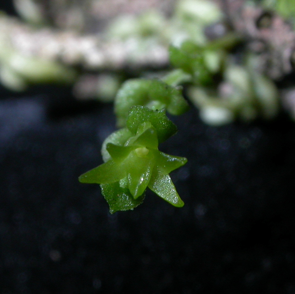 Found in penninsular Malaysia, Java, New Guinea and Borneo in lower montane forests at elevations around 900 to 1500 meters as a miniature sized, warm to cool growing, twig epiphyte with a very short stem carrying 2 to 4, lanceolate, apiculate, sessile leaves that blooms in the winter and summer on a glabrous, angular, fractiflex, 6 to 8 flowered inflorescence with each flower arising from imbricate, persistent, triangular bracts