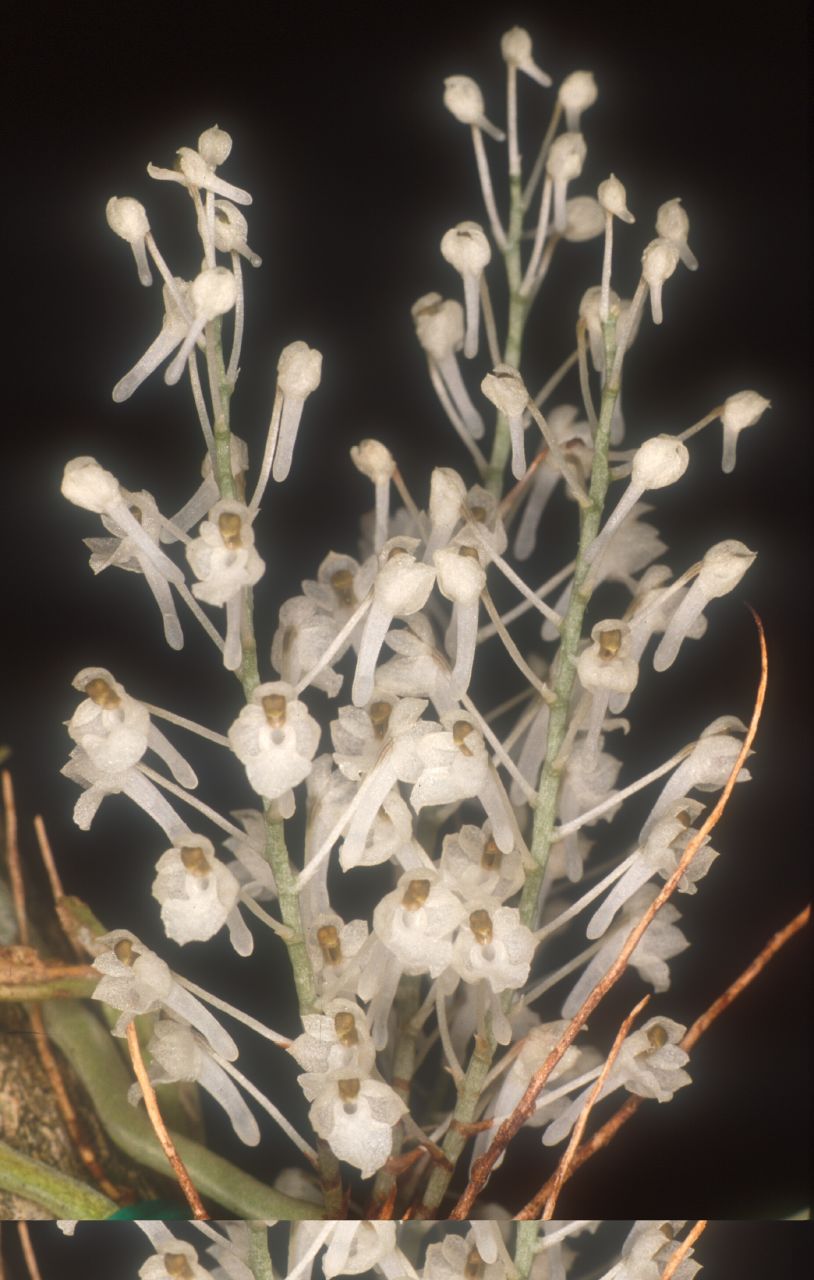 Found in west and northwest Madagascar in woodlands and bush from sealevel to 500 meters as a small sized, hot growing epiphyte or occasional lithophyte with a few to many simple to branched, flattened to rounded roots that blooms fall through spring on up to 40, simultaneous, adpressed to the stem, terete, smooth, to 3.6" [9 cm] long, to 26 flowered inflorescence with sheathing, ovate, acute to subacute, single nerved bracts .